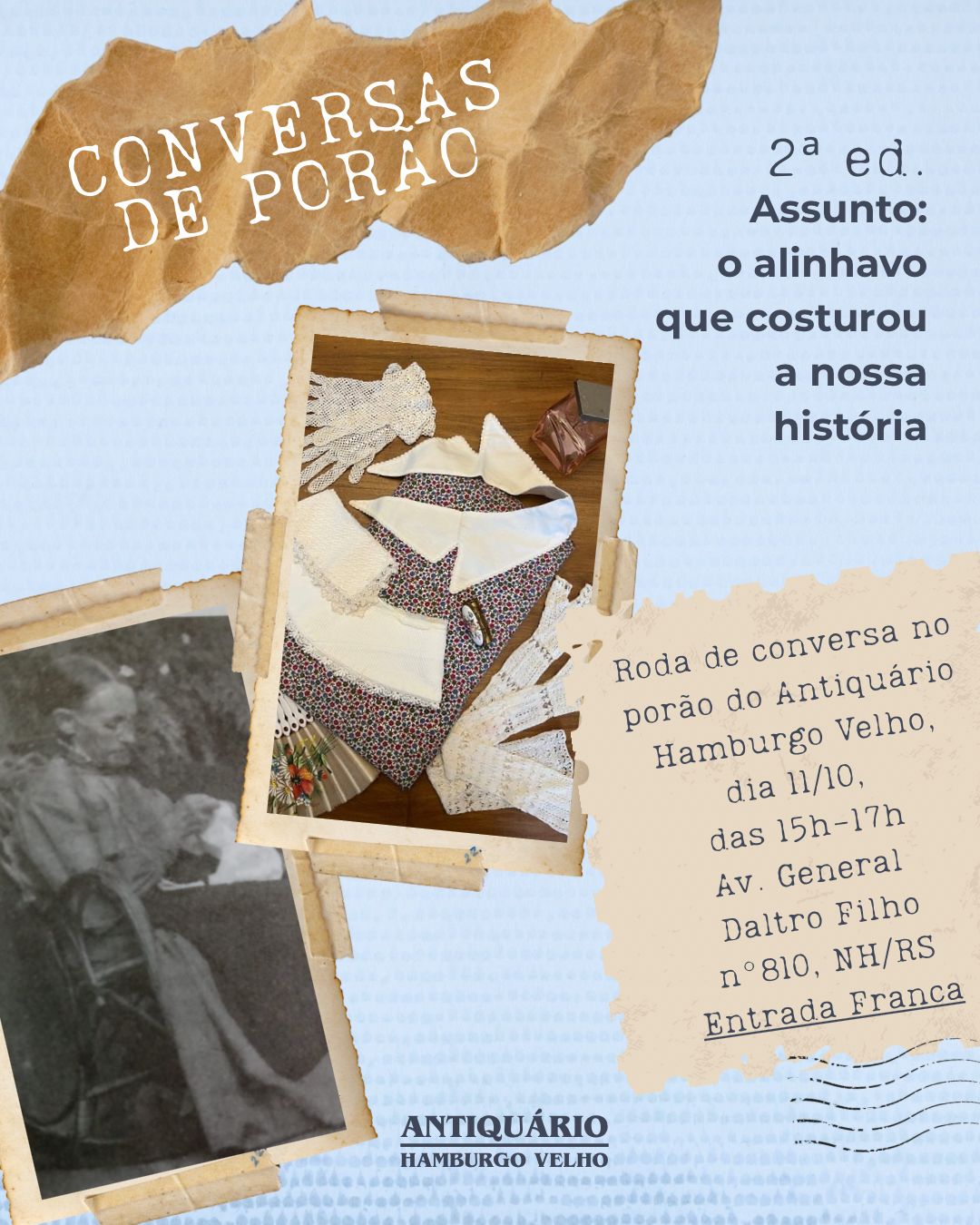 A 2ª edição do projeto “Conversas de Porão”, do Antiquário Hamburgo Velho, acontece neste sábado (11/10) das 15h às 17h. O assunto da vez nessa tarde de conversas será a moda e suas transformações desde a chegada dos imigrantes alemães aqui na nossa região, até 1950.