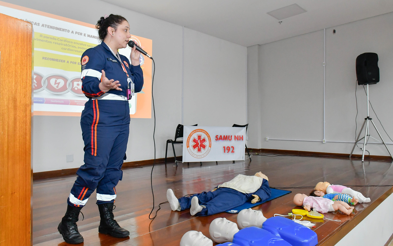 A atividade foi ministrada pela coordenadora do SAMU, enfermeira Tainah Lindner, e os técnicos de enfermagem Raul Fuhr, Vinicius Borges e Nilmar Castro da Silva, além do apoio de Luana Barcellos.