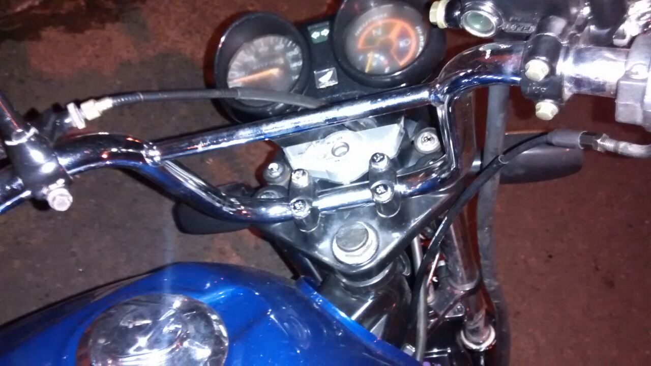 A guarnição do núcleo comunitário Santo Afonso, em ação de policiamento, abordou o indivíduo trafegando com uma motocicleta Honda CG150 azul, com o número do chassi e do motor raspado e com uma placa adulterada de outra motocicleta.