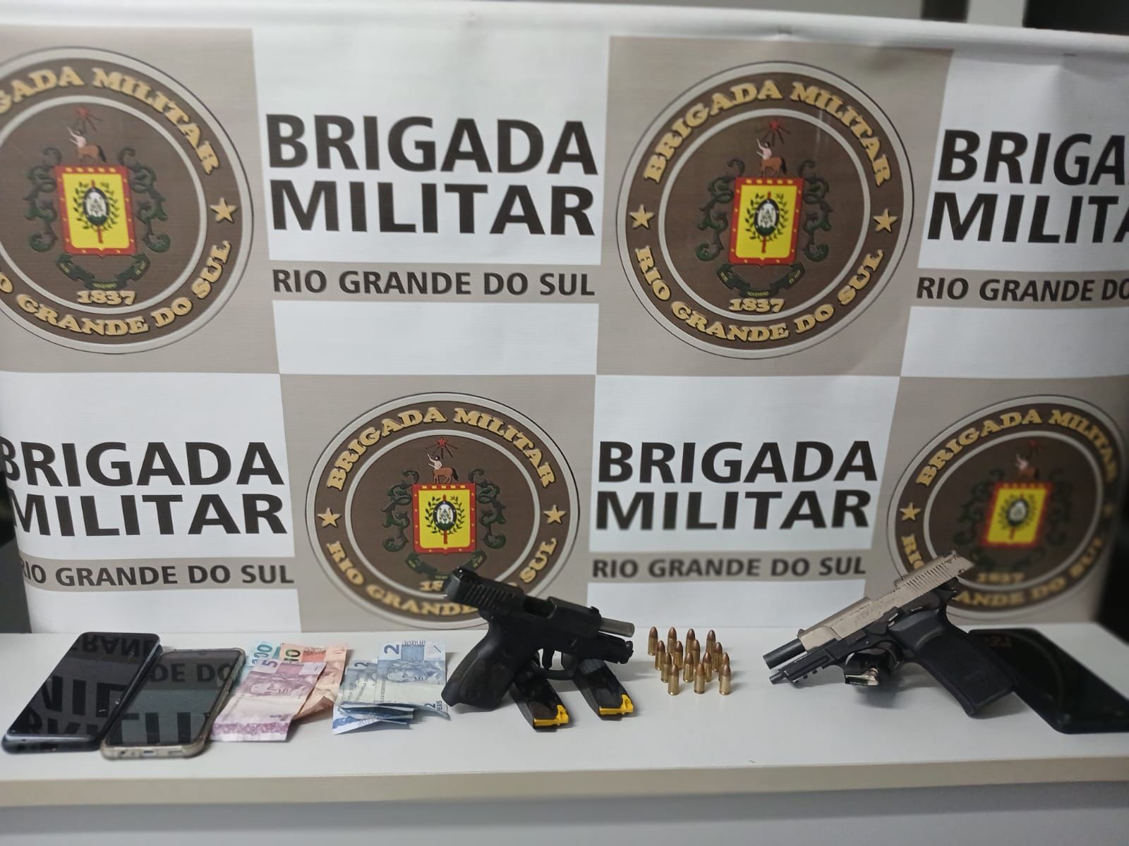 A guarnição foi acionada após denúncia de disparos de arma de fogo em frente a um bar. Durante as buscas no local, os indivíduos foram abordados e duas pistolas calibre 9mm foram apreendidas, além de munições, carregadores, celulares e dinheiro.