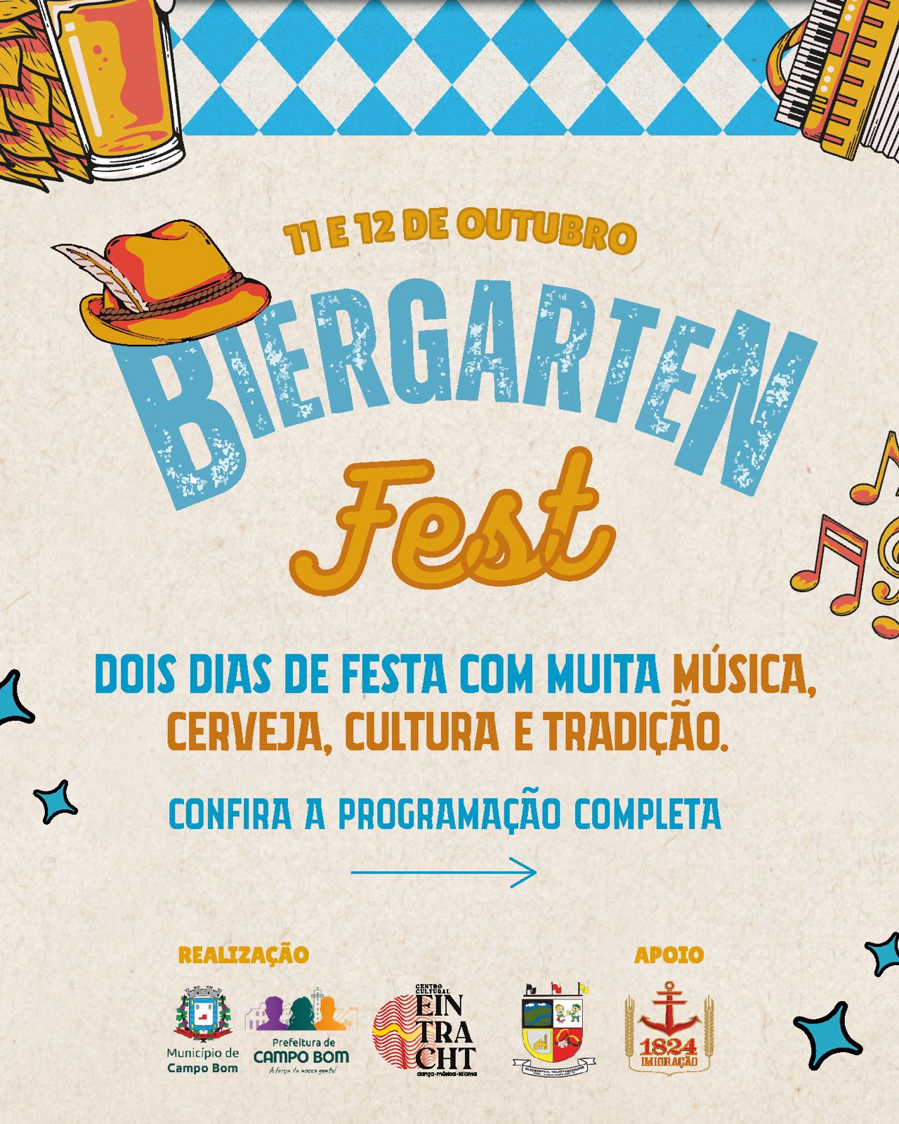 A Prefeitura de Campo Bom, em parceria com o Centro Cultural Eintracht e a Glockenthal e com apoio da Cervejaria Imigração, realiza nos dias 11 e 12 de outubro a primeira edição do Biergarten Fest, evento que integra o calendário cultural do Festival da Primavera. A festa reunirá música, gastronomia, cerveja artesanal, jogos típicos, atrações culturais e momentos de lazer para toda a família, na Rua Coberta.