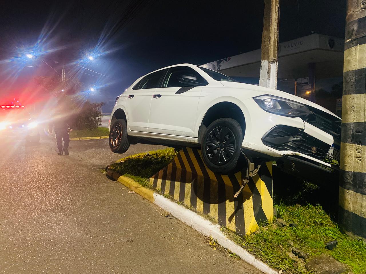 Carro de motorista de aplicativo estava sobre proteção de concreto no bairro Santo Afonso
