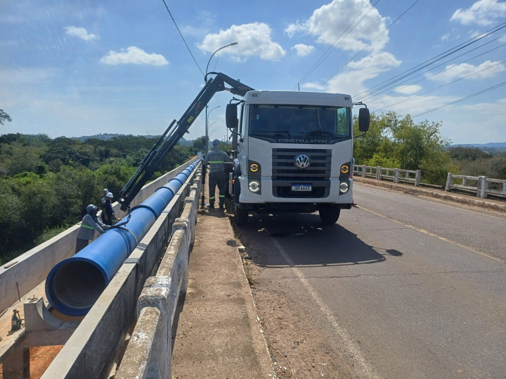 Os trabalhos avançaram no início de março com a chegada de uma nova remessa de tubos e o início das intervenções diretamente sobre a ponte do banhado. Nesta etapa, sete tubos inteiros já foram instalados sobre a estrutura. Na sequência, serão assentados aproximadamente seis tubos no trecho da pista, etapa que marcará a conclusão da instalação da nova adutora.