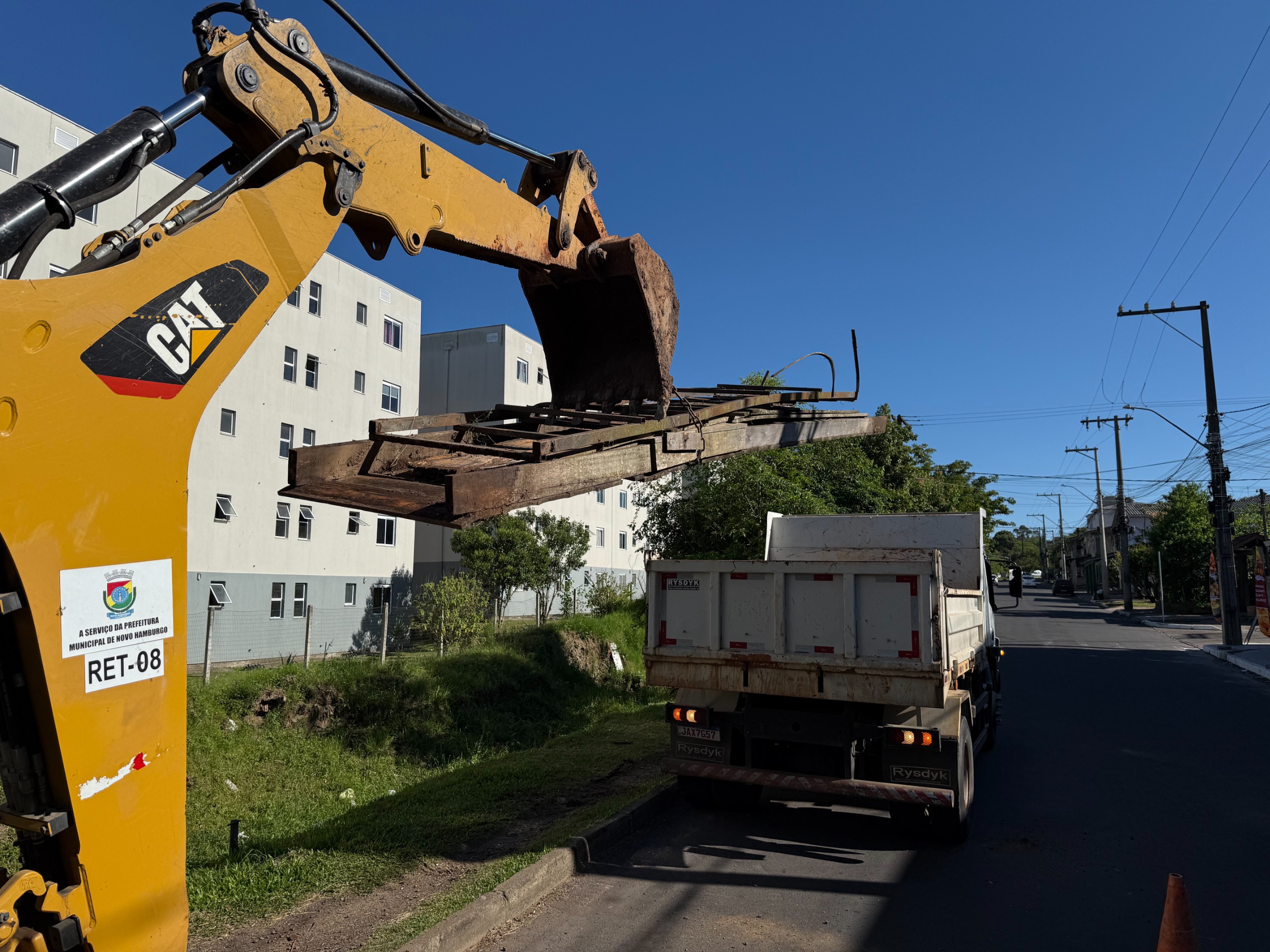 A ação busca encerrar o descarte irregular de resíduos no córrego local, atrás do condomínio Salgado Filho. Somente entre segunda-feira (20/10) e hoje, foram retirados cerca de 60 metros cúbicos de entulho, com o uso de caminhões e retroescavadeiras.