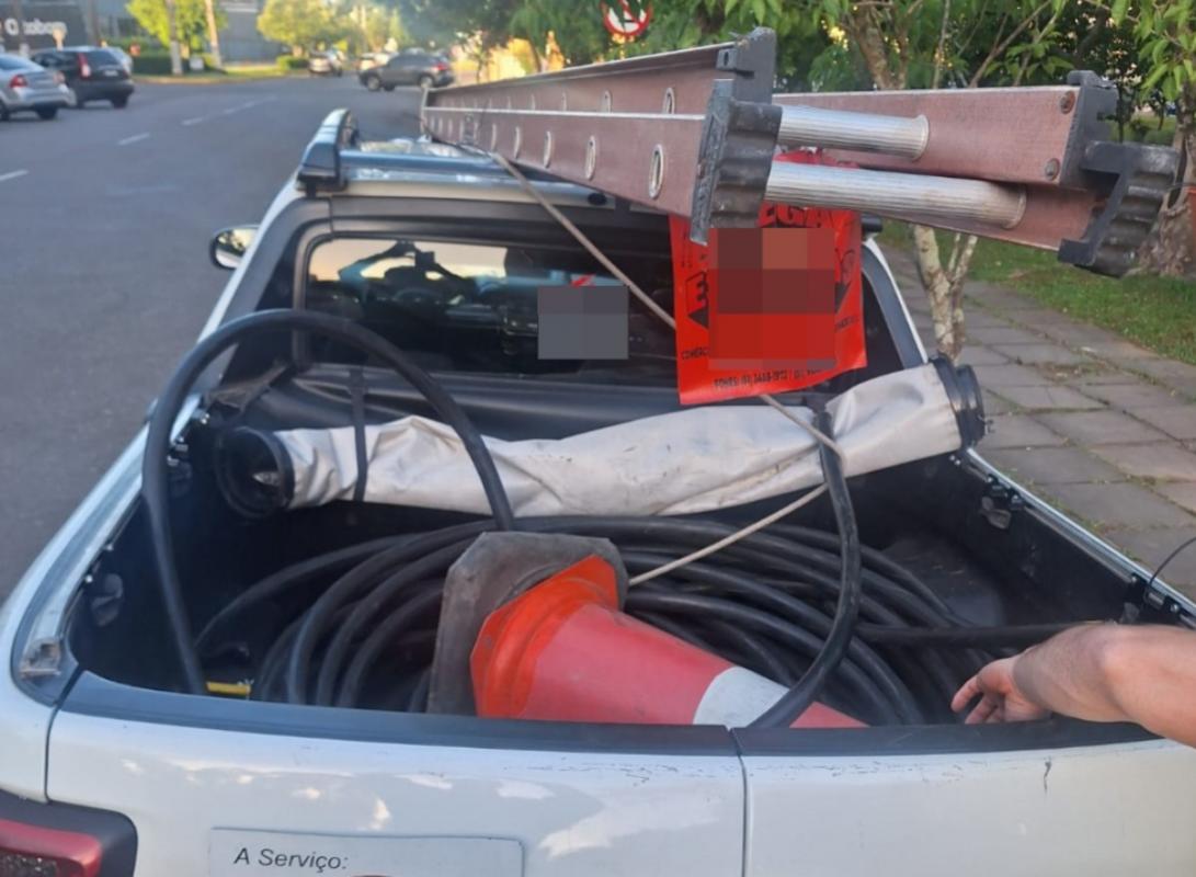 Na caçamba do veículo, além dos cerca de 200 quilos de fios e cabos telefônicos, foram encontradas ferramentas utilizadas para o corte, como serras, alicates, uma tesoura corta-vergalhão e uma escada de seis metros.